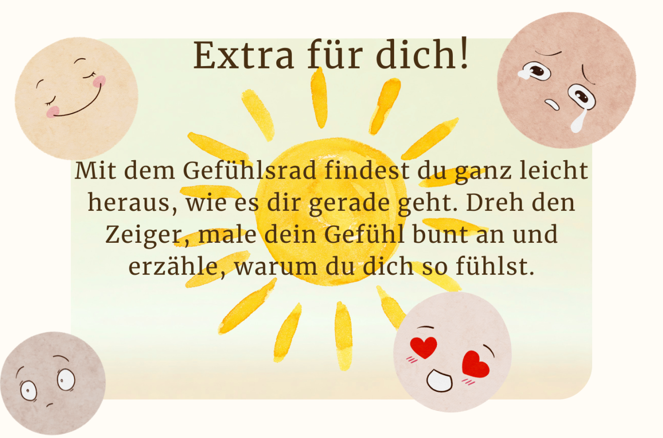 Mit einem Gefühlsrad können sie spielerisch ausdrücken, wie es ihnen gerade geht – ob fröhlich, traurig, wütend oder ruhig.