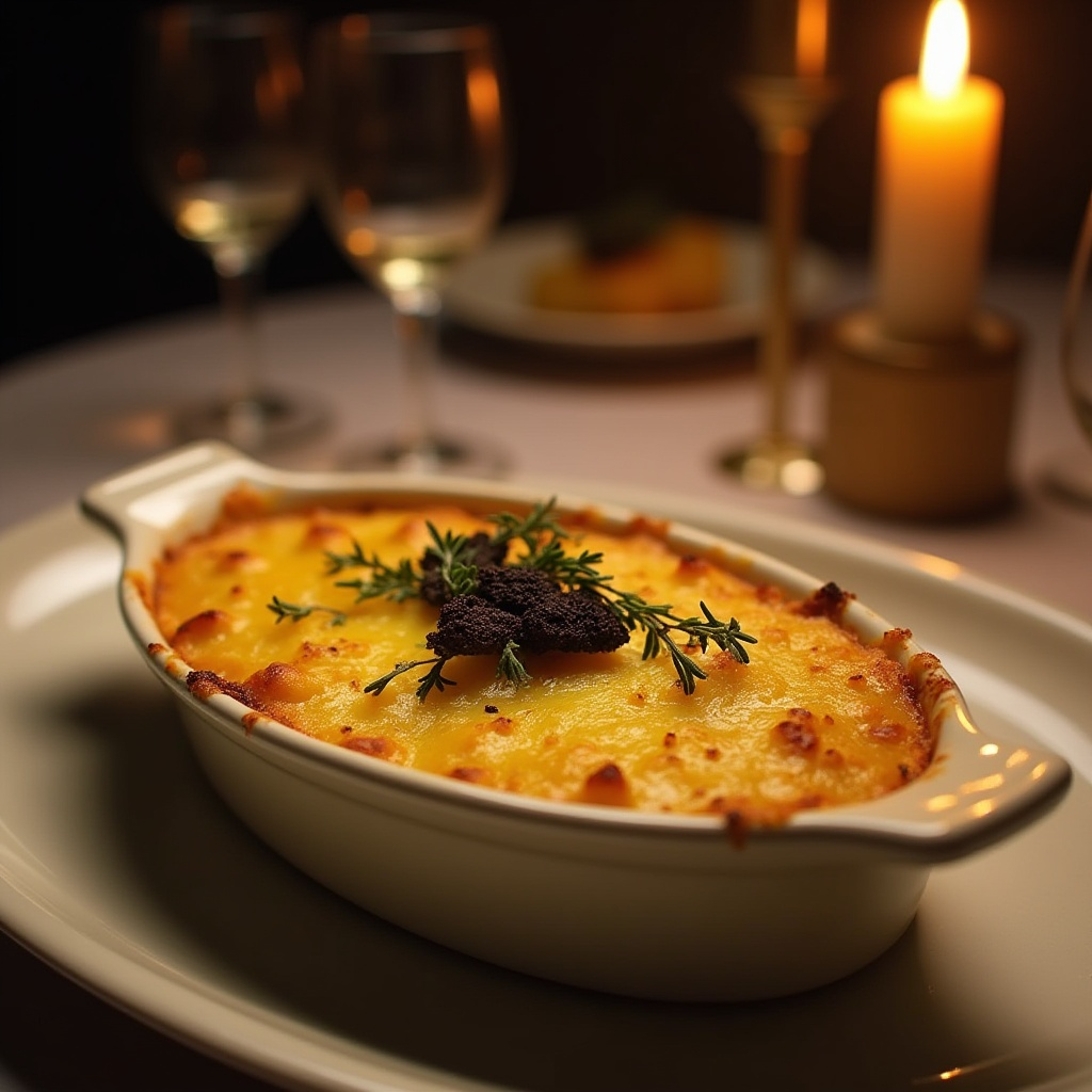 Der erste Bissen ist pure Dekadenz: die cremigen, zartschmelzenden Kartoffeln, die knusprige Käsekruste, der intensive, erdige Trüffelduft, der jeden Geschmackssinn betört. Jede Schicht ist perfekt gegart, jeder Bissen eine kleine Geschmacksexplosion von salzigem Käse, aromatischem Thymian und dem unverwechselbaren Luxus der Trüffel.